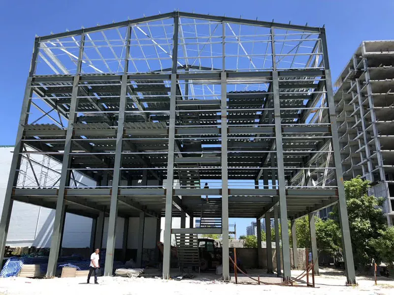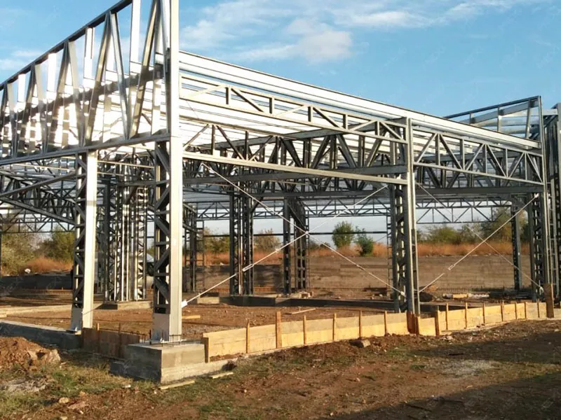 4. স্টিল স্ট্রাকচার ইন্সটলেশন পূর্বনির্মাণকৃত ইস্পাত উপাদানগুলিকে নির্মাণস্থলে নিয়ে যাওয়া হয় এবং ক্রেন এবং অন্যান্য ভারী যন্ত্রপাতি ব্যবহার করে একত্রিত করা হয়। ইনস্টলেশন প্রক্রিয়াটি শুরু হয় ফাউন্ডেশনে কলামগুলিকে খাড়া করা এবং নোঙর করার মাধ্যমে, তারপরে গুদামঘর ফ্রেম তৈরির জন্য বিম ইনস্টল করা হয়। ছাদের ট্রাসগুলি ছাদ ব্যবস্থাকে সমর্থন করার জন্য সুরক্ষিত করা হয়।
